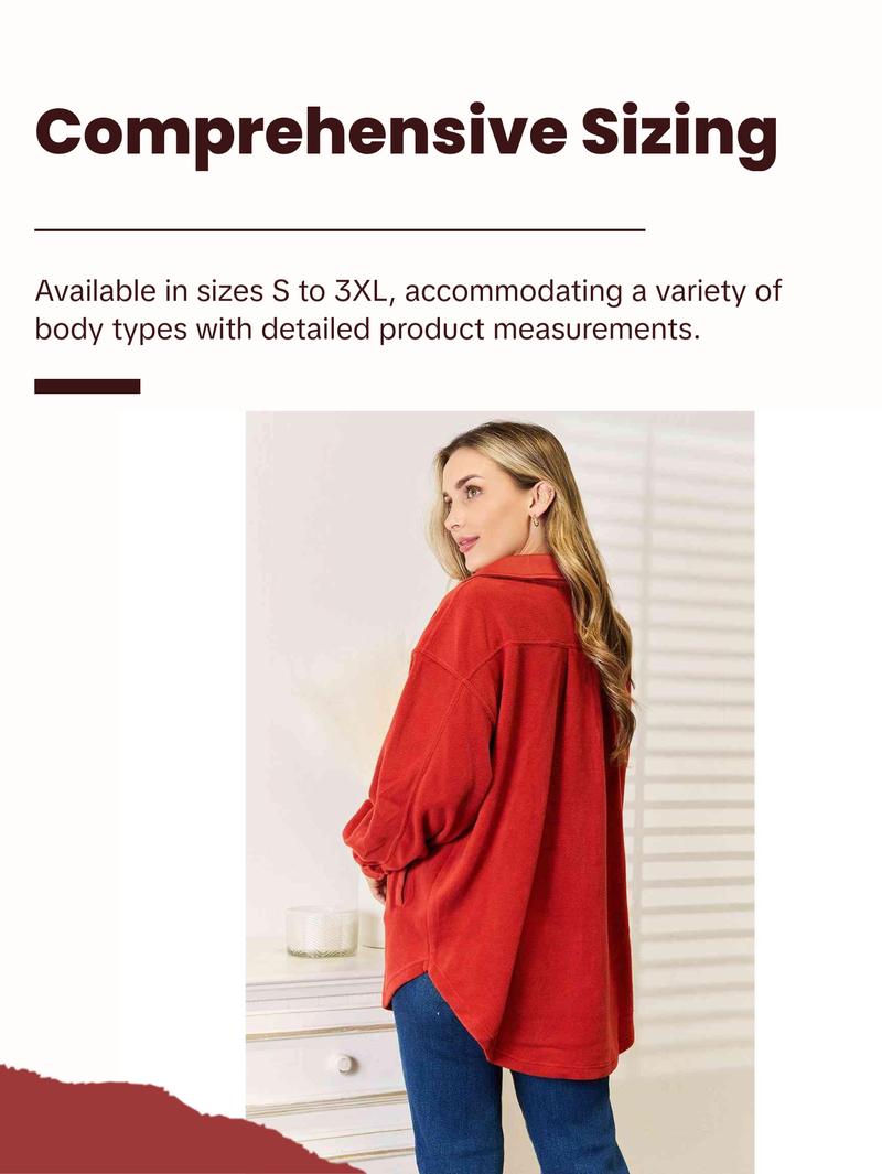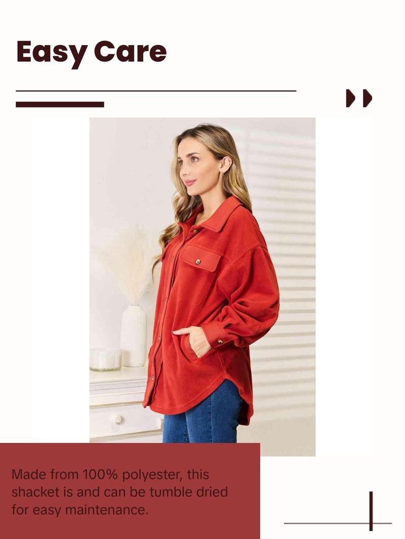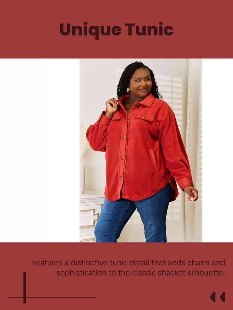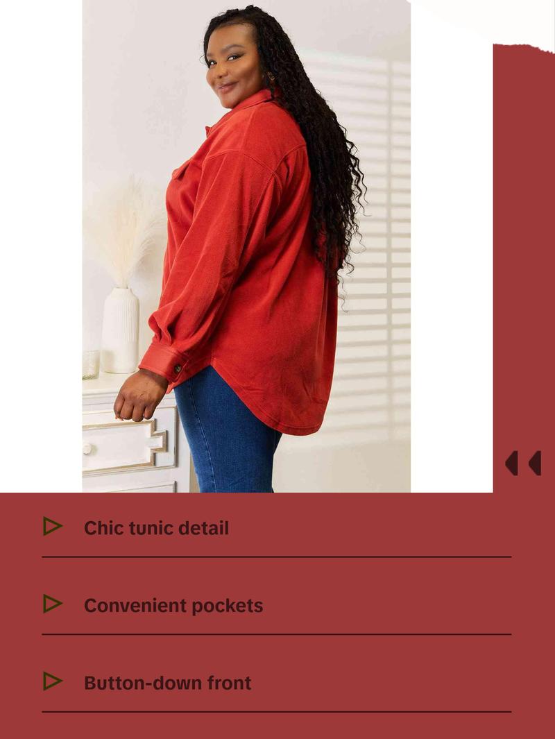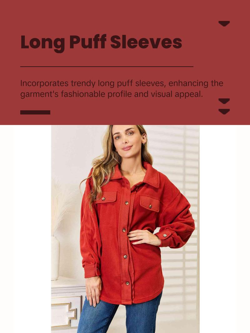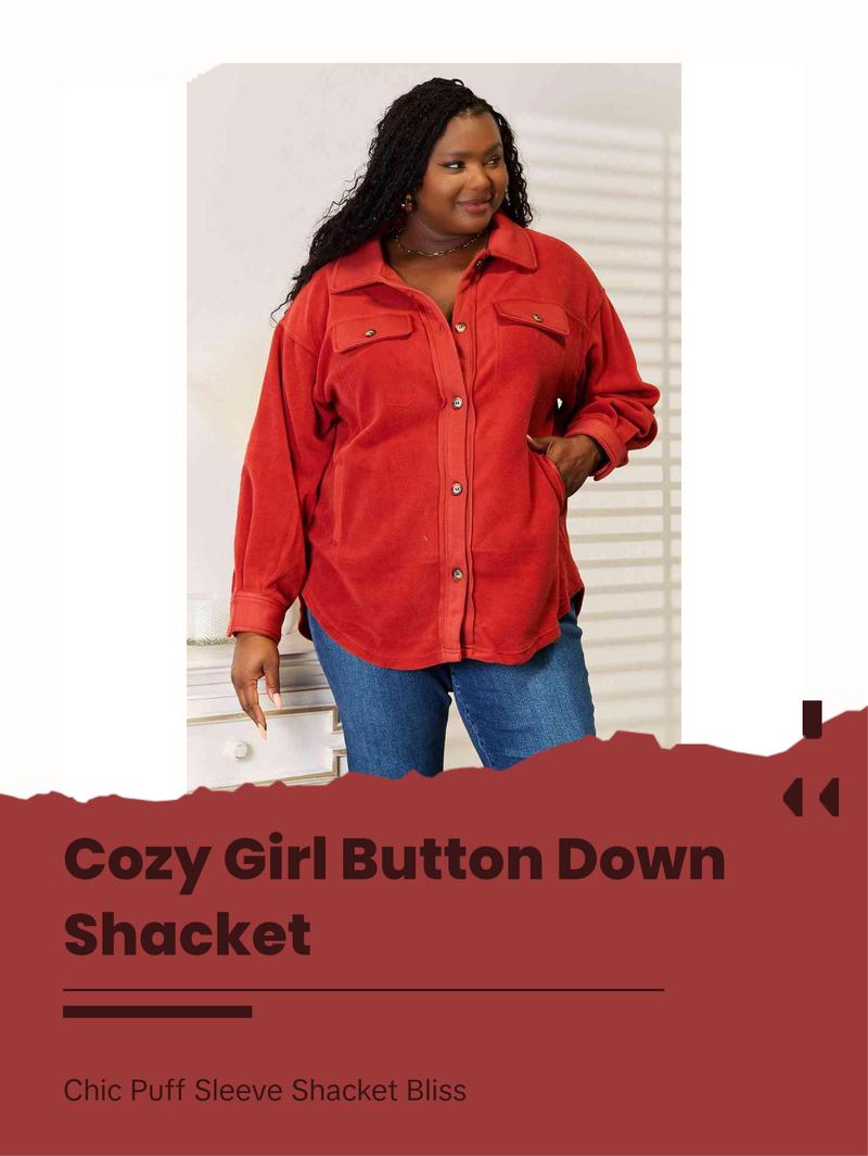This versatile piece features a unique tunic detail, elevating its charm and sophistication. The shacket is designed with convenient front and side pockets, providing ample space for essentials while on the go. Embrace a chic and cozy look with its button-down front and classic collar, perfectly complemented by the trendy long puff sleeves.