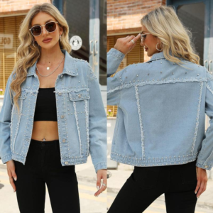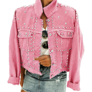 Covered in shimmering rhinestones and metallic pearl studs, this jacket adds instant glamour to any outfit. The sparkling design catches the light beautifully, making it ideal for concerts, parties, or standout streetwear looks.